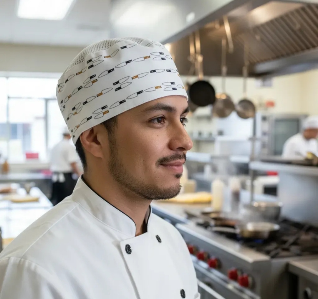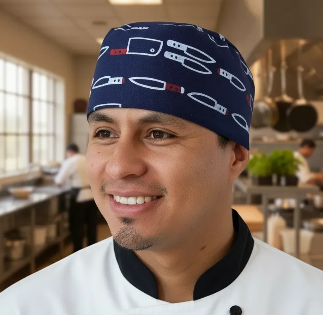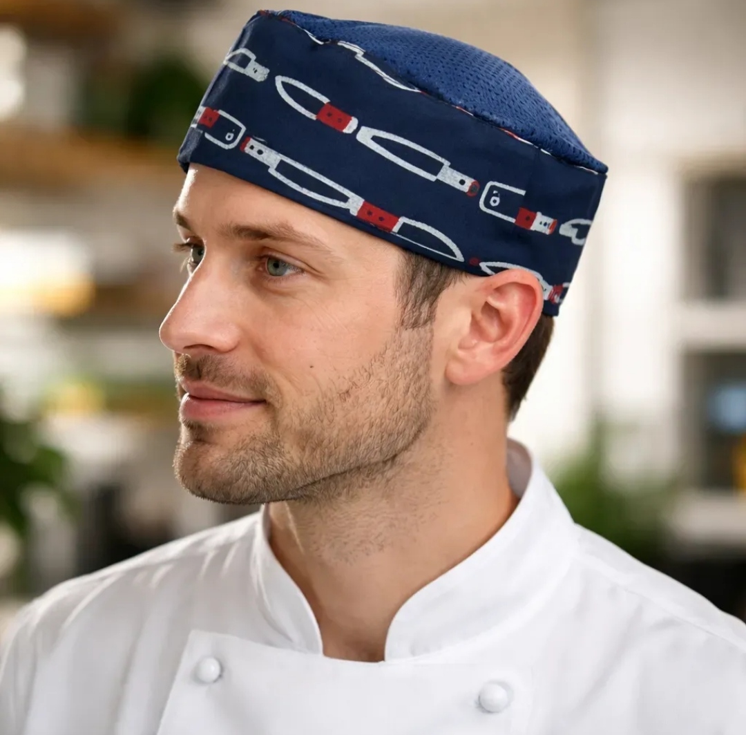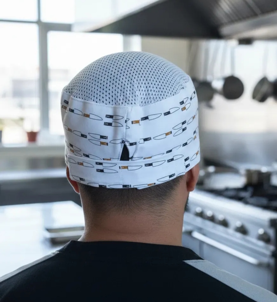 Gorro redondo de gabardina de algodón y poliester forrado de algodón con malla arriba y velcro atrás para ajustar. Unitalla.