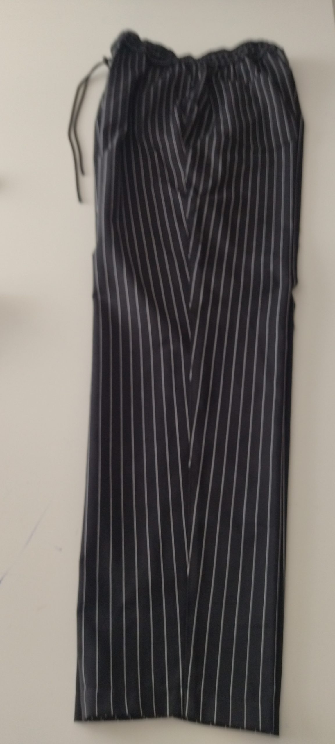 Pantalón negro con rayas blancas en tela 45% algodón y 55% poliester. Con bolsas a los costados y una bolsa atrás. De resorte y jareta.