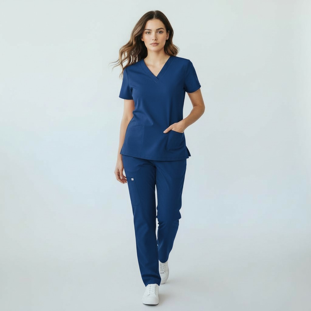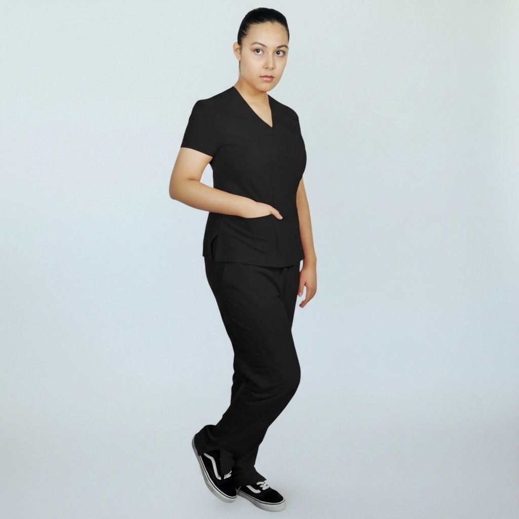 Conjunto Médico en tela anti fluidos 96% poliester y 4% elastano. Tiene dos bolsas grandes en el frente de la filipina, en el pantalón 2 bolsas en los costados y una bolsa de cargo,